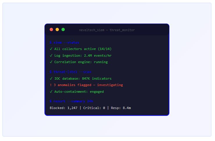 neveltech SIEM platform aggregates and correlates logs from every device, application, and network segment in your environment. Machine learning models detect behavioral anomalies that signature-based tools miss.
