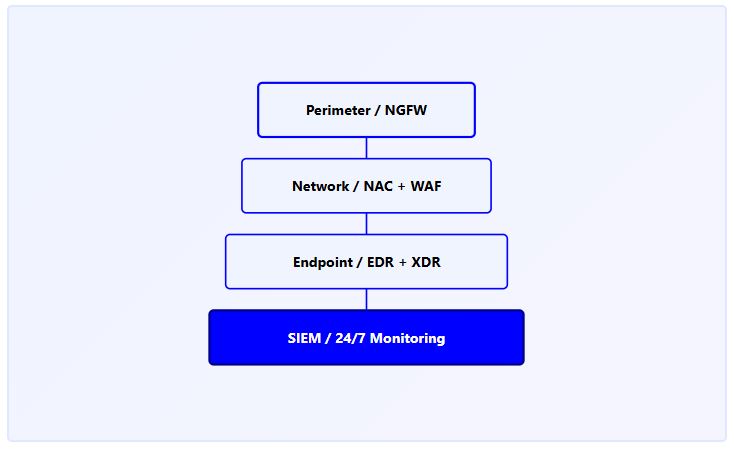 From next-generation firewalls at the perimeter to endpoint detection on every device, every layer works together under unified management and continuous monitoring.